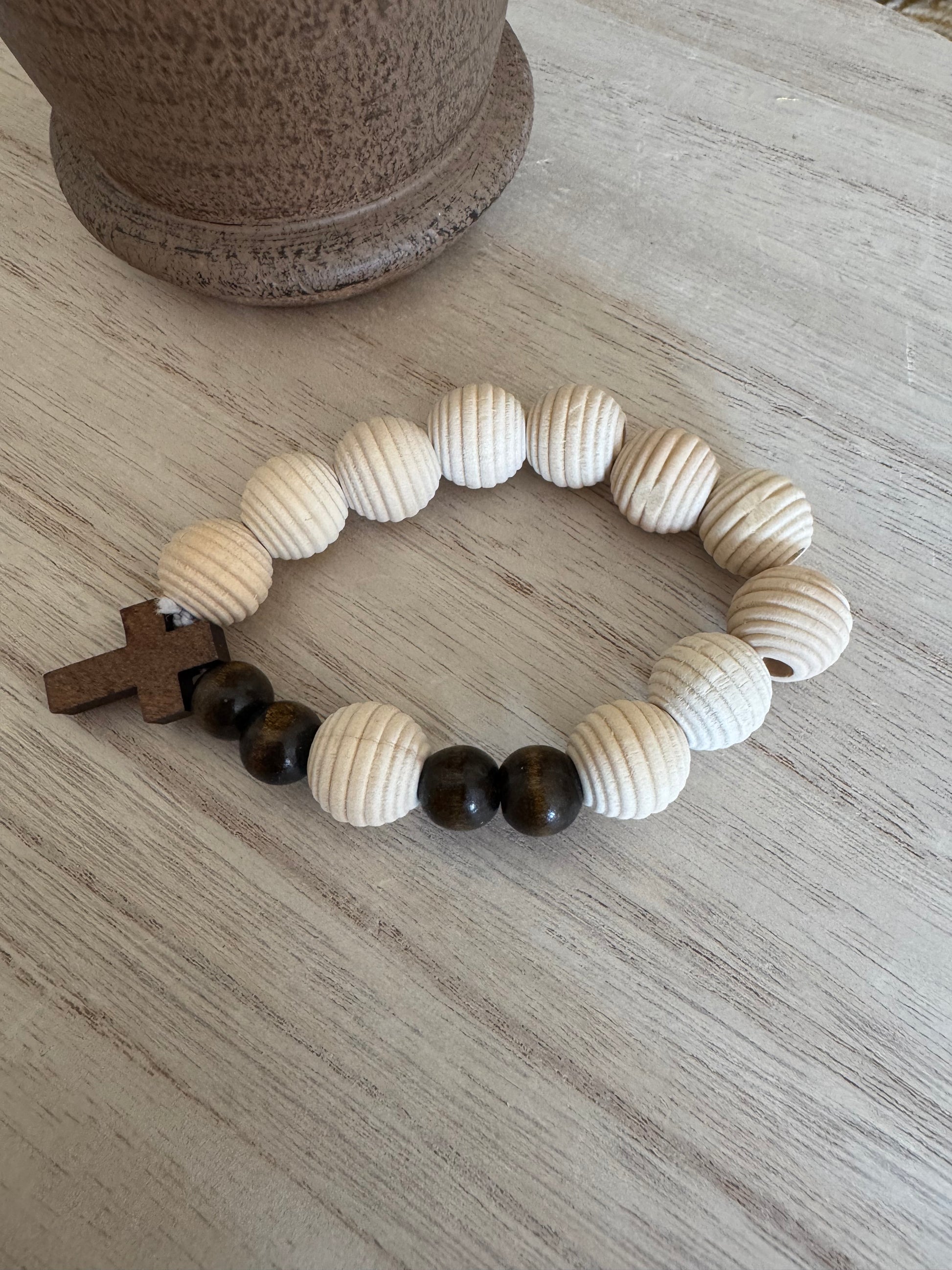 Handmade rosary bracelet featuring 10mm ribbed wooden beads and a dark wooden cross charm. The textured ribbed beads add depth and character, giving this bracelet a bold yet natural look that stands out while remaining simple and faith-focused.