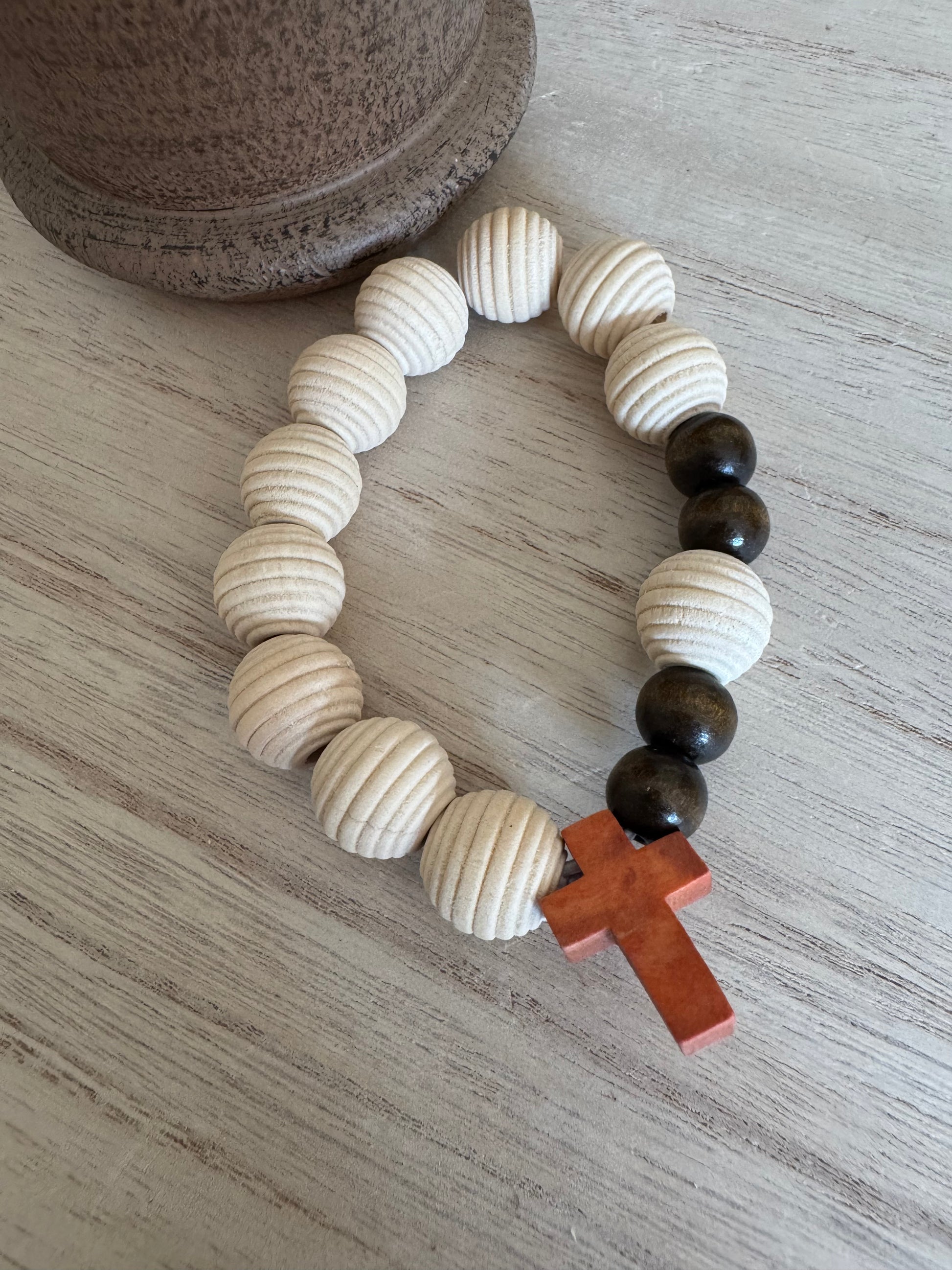 Handmade rosary bracelet featuring 10mm ribbed wooden beads and a red wooden cross charm. The textured ribbed beads add depth and character, creating a bold yet natural look that is both stylish and faith-inspired.