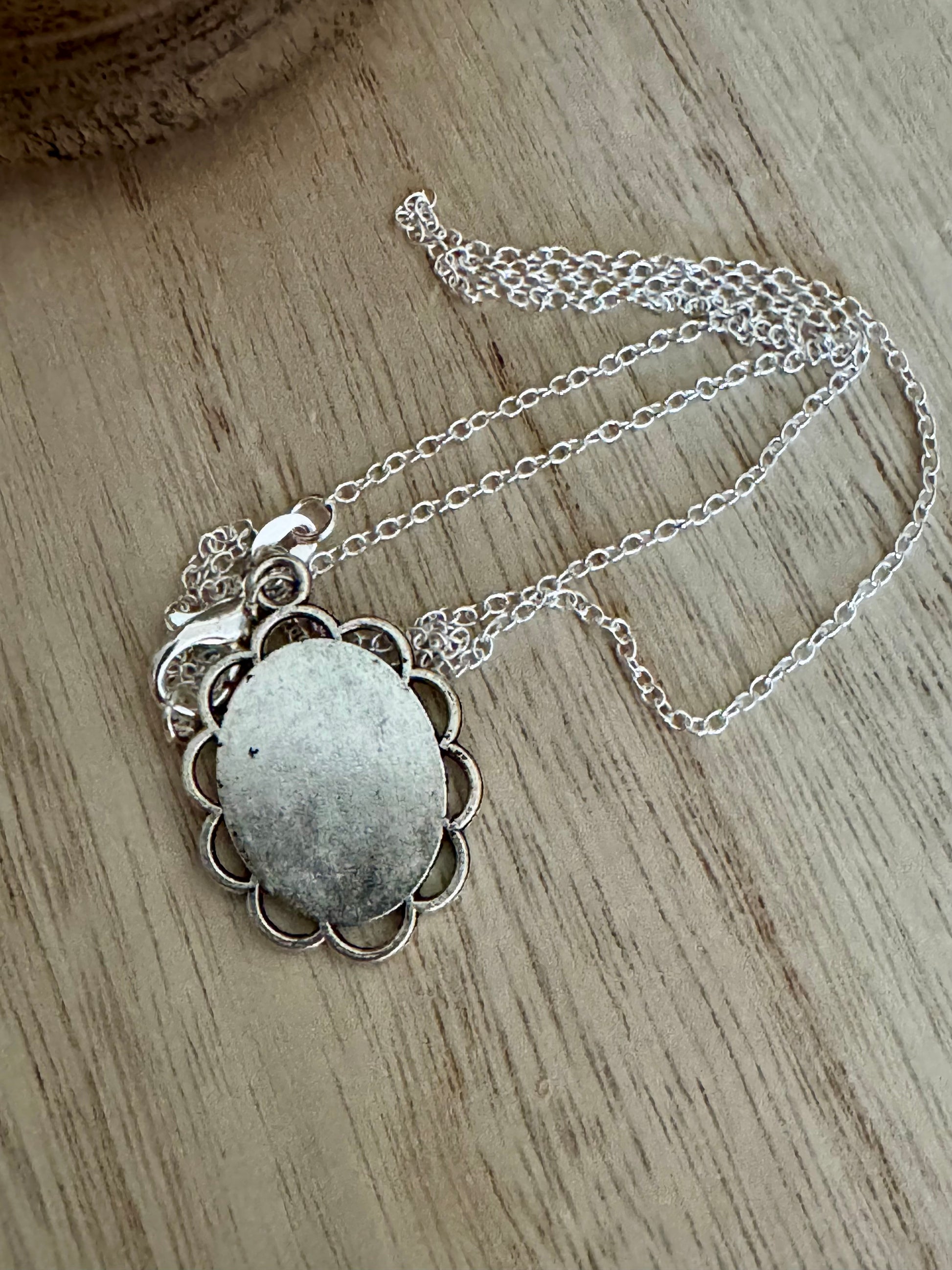 Beautifully handcrafted with an antique-inspired look, this 20-inch vintage-style silver necklace features a Catholic sacred image pendant designed to inspire faith and devotion. Though newly made, the silver finish gives it a timeless, old-world appearance that feels like a cherished heirloom.