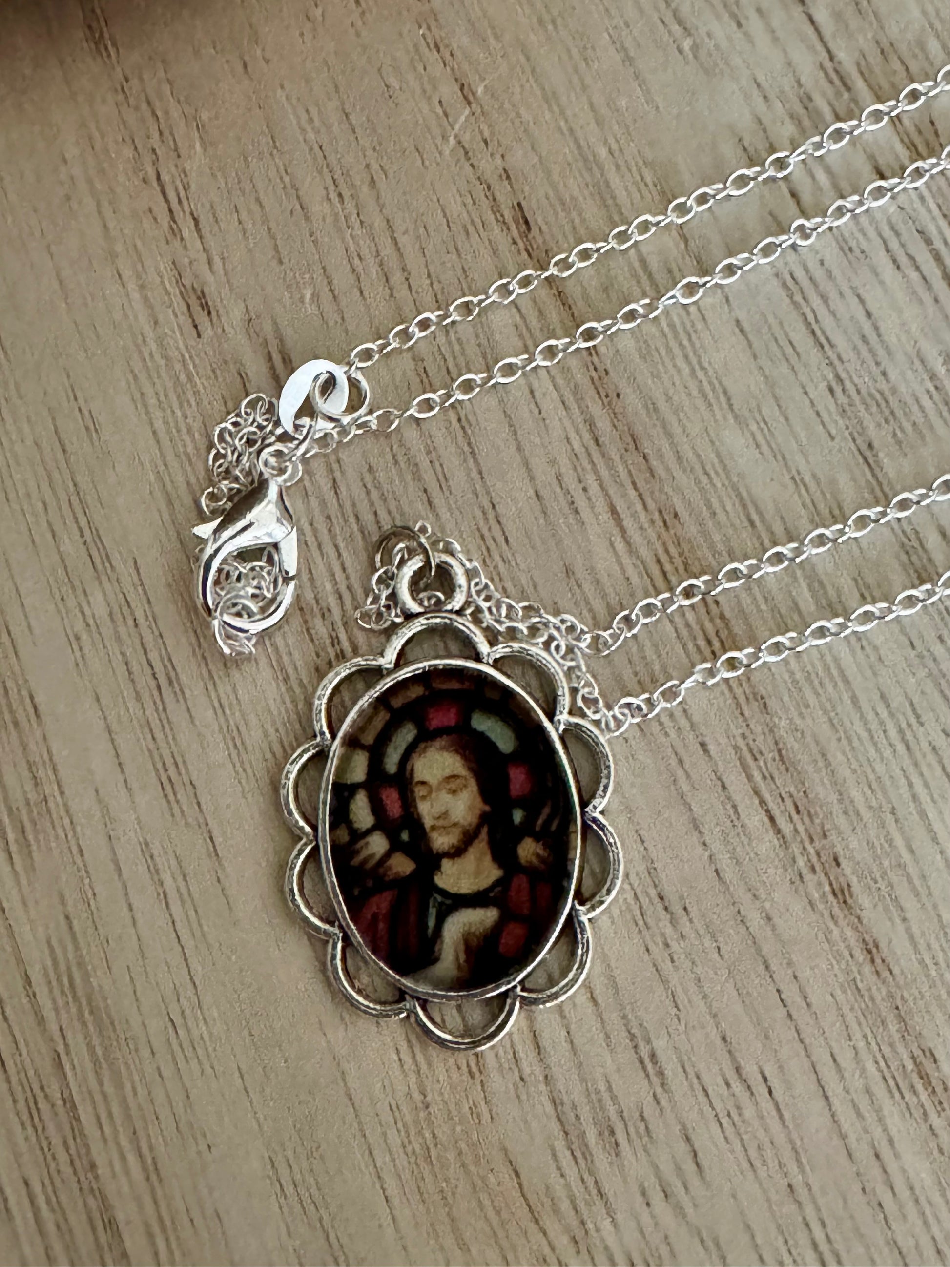 20” Vintage-Style Silver Catholic Sacred Image Jesus Necklace