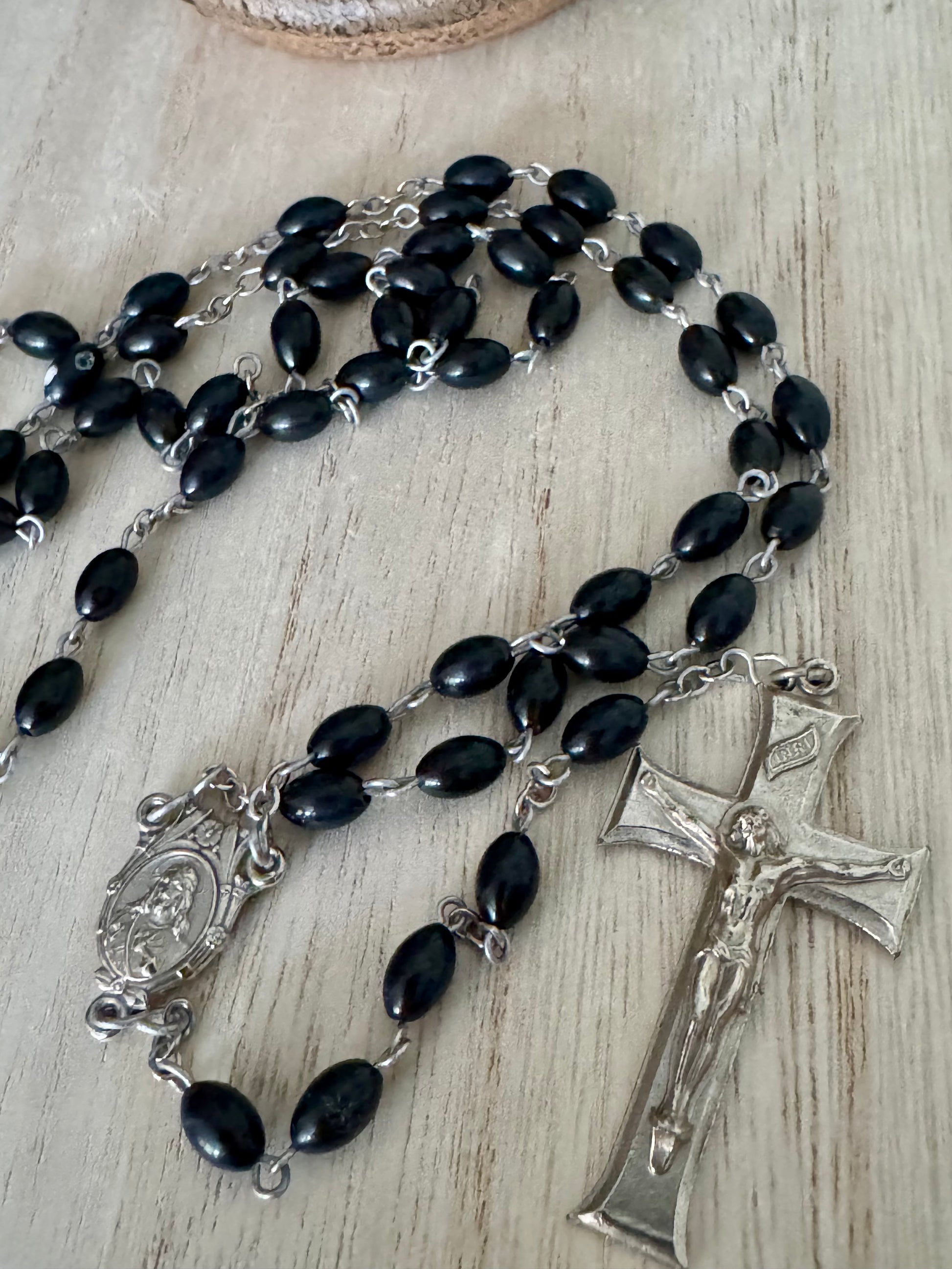 Black Bead Rosary with Silver Crucifix and Center
