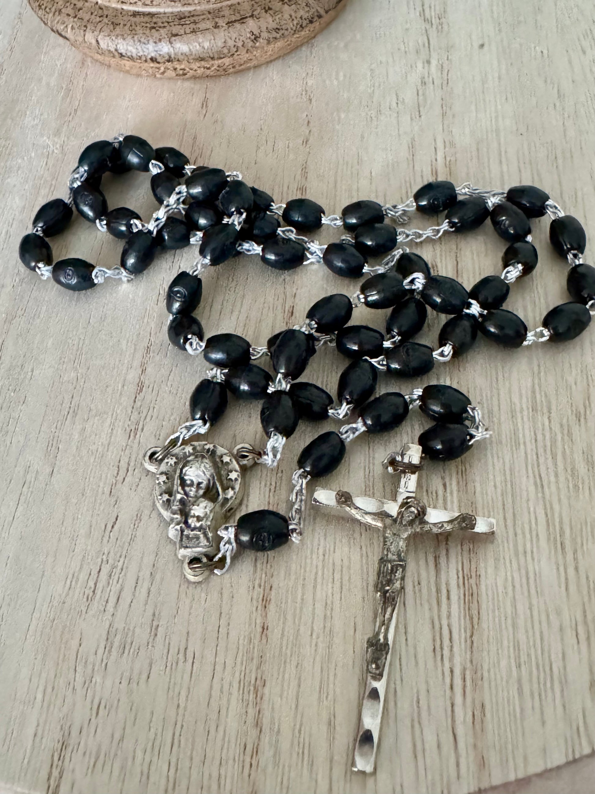 This 17.5-inch vintage rosary features black beads paired with silver-tone accents, crafted in Italy. Lightweight and durable, it is designed for daily prayer and devotion. A timeless Catholic rosary suitable for teens, adults, or as a meaningful gift for First Communion, confirmation, or other religious occasions.