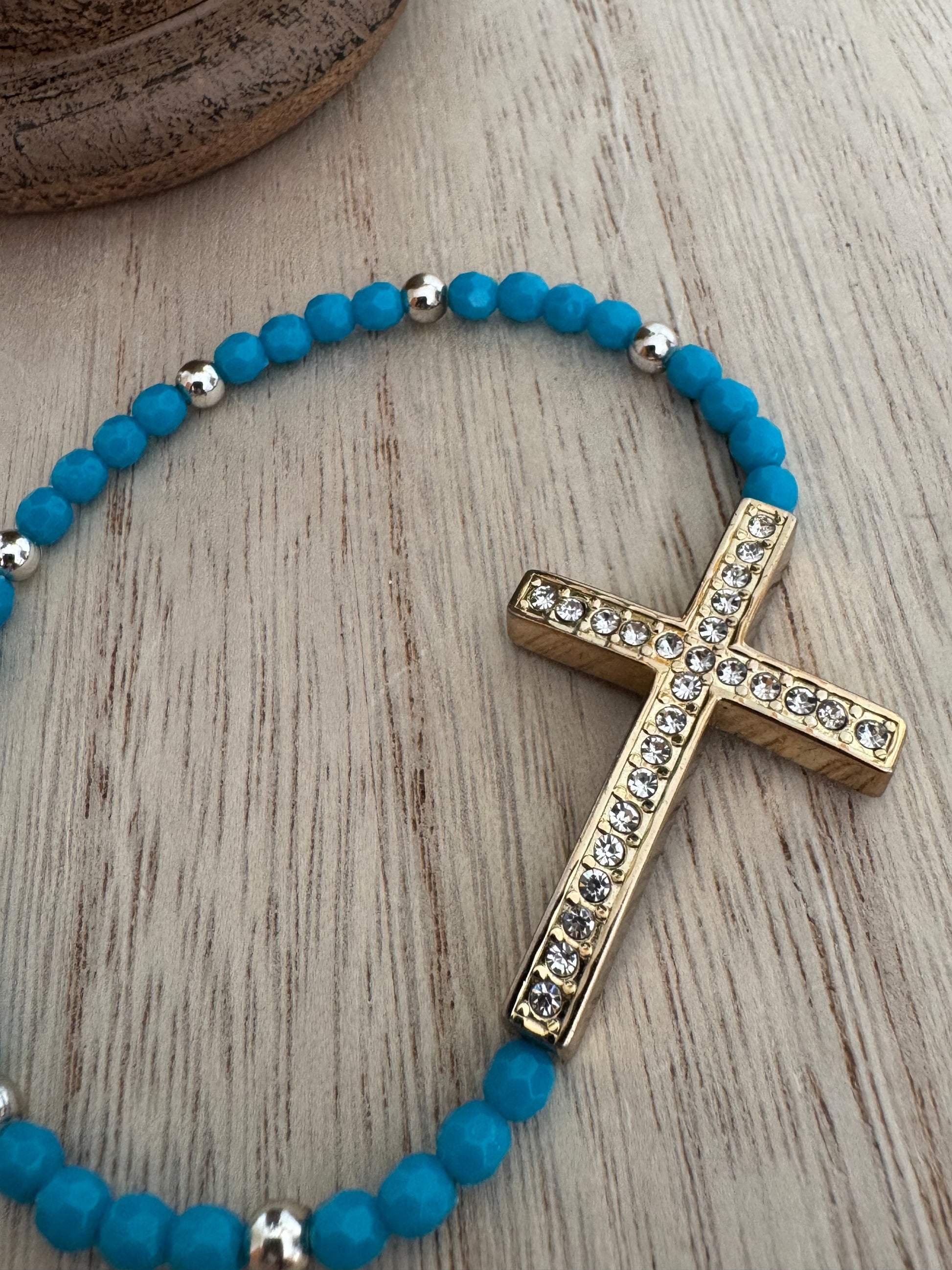 Add a pop of color to your devotional jewelry collection with this bright blue stretchy bracelet. Featuring small seed beads and a gold-colored cross adorned with sparkling rhinestone accents, this bracelet combines faith, elegance, and everyday wearability.