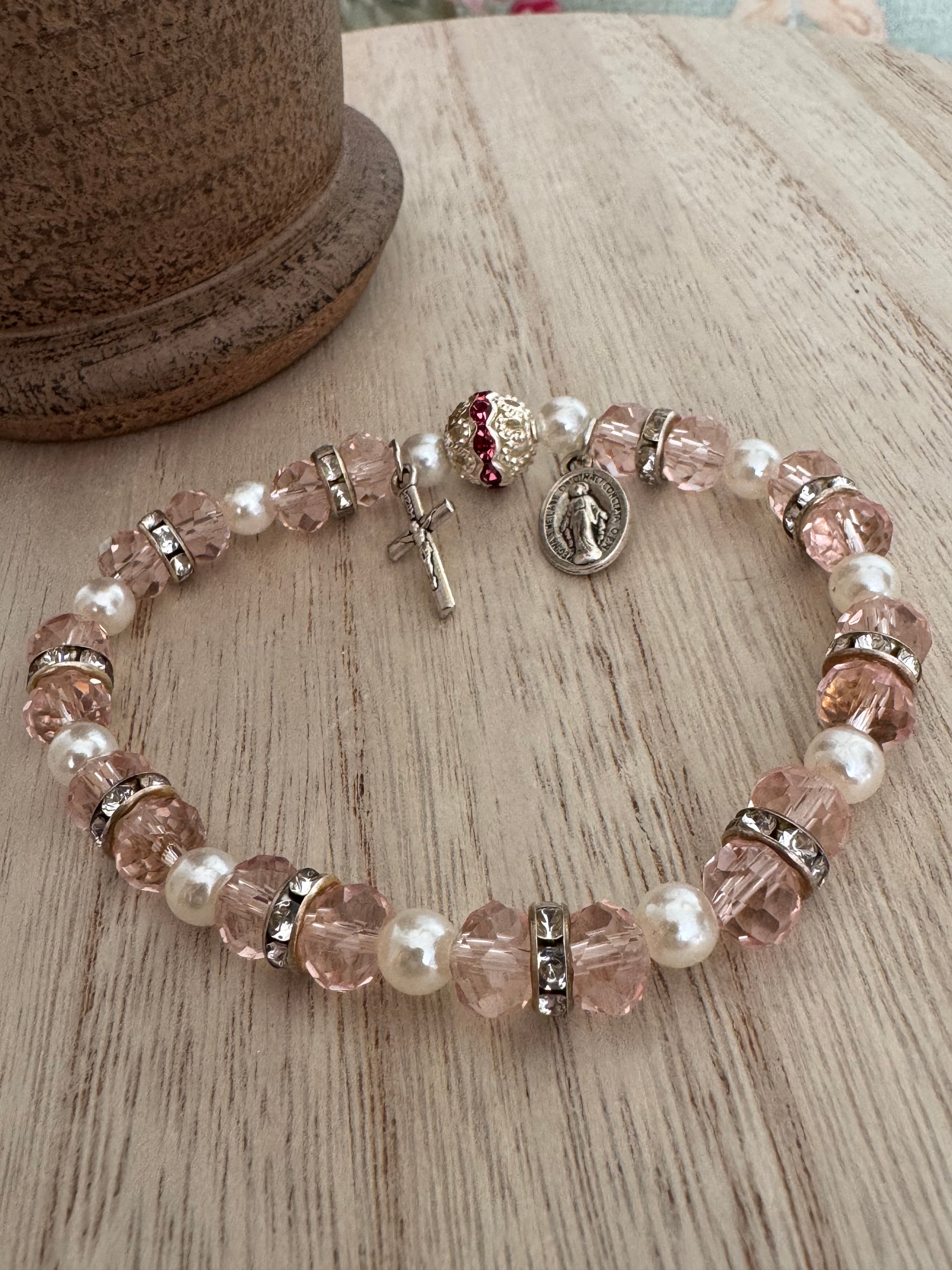 This beautiful handmade stretch bracelet features pink crystal-style beads paired with white faux pearl-style beads, creating a soft and elegant look. A crucifix charm and Miraculous Medal highlight the design, with a beautiful center bead serving as the focal point.