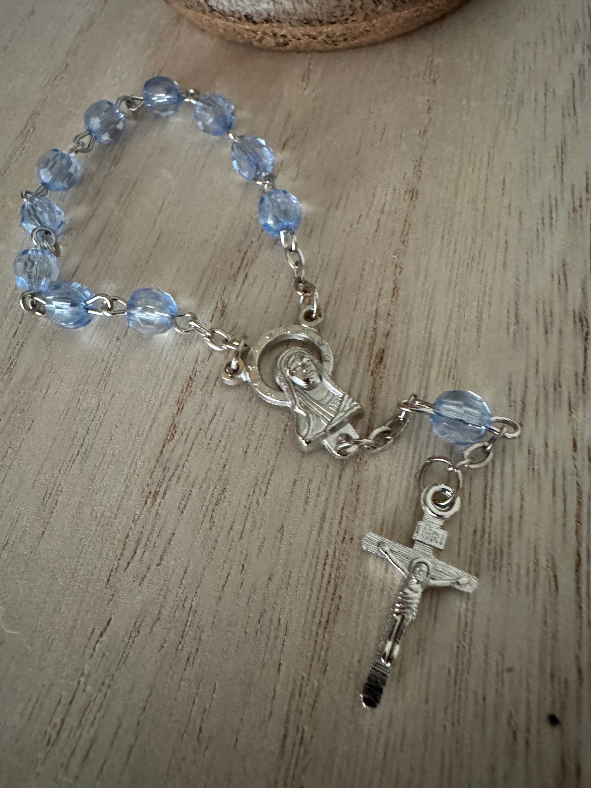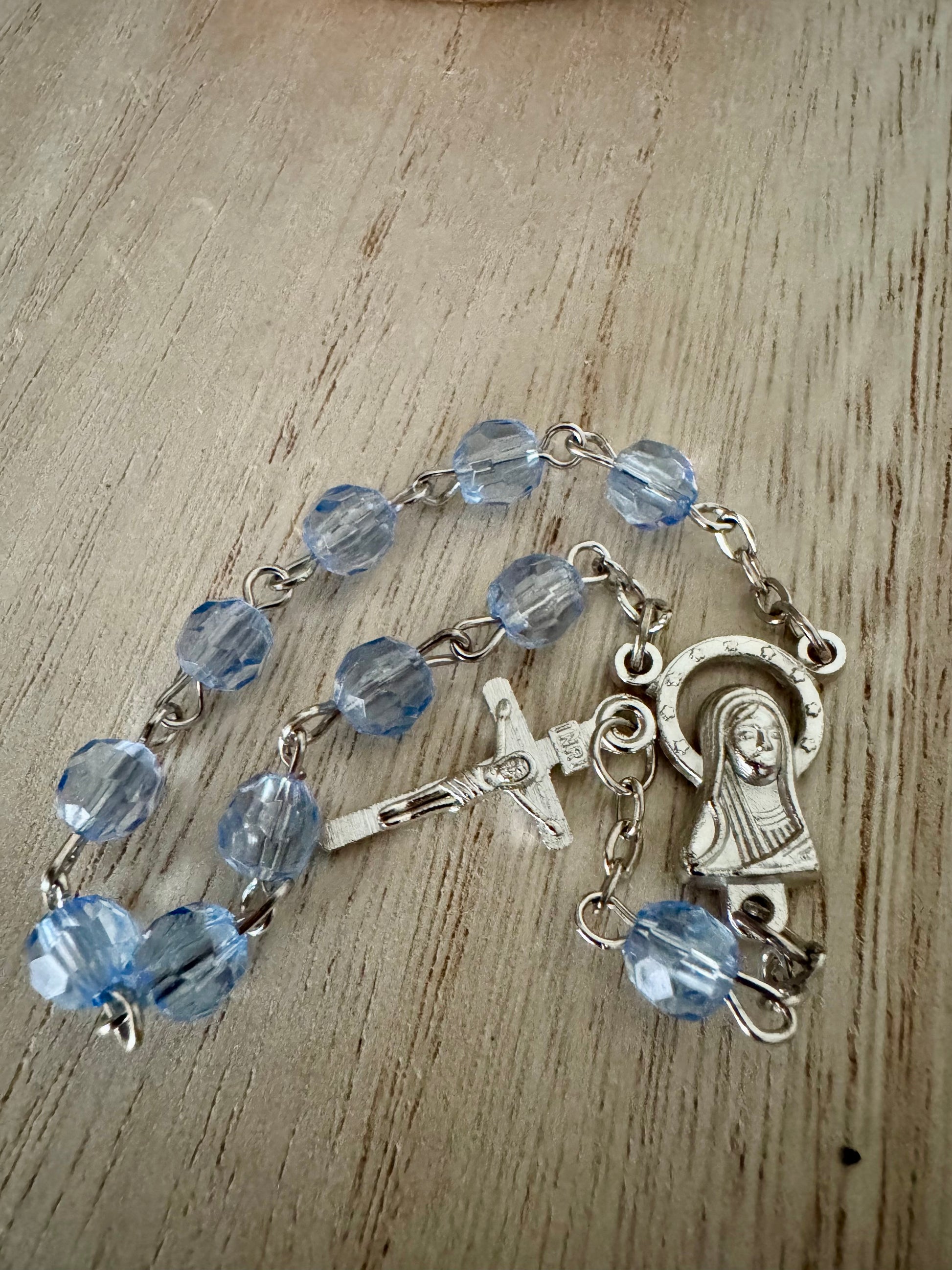 This single-decade rosary features bluish-purple plastic beads accented with silver-tone details. Lightweight and durable, it is designed for prayer and devotion, making it ideal for teens, adults, or as a portable rosary for daily prayer, travel, or devotional use. A meaningful Catholic item perfect for First Communion, confirmation, or as a thoughtful gift.