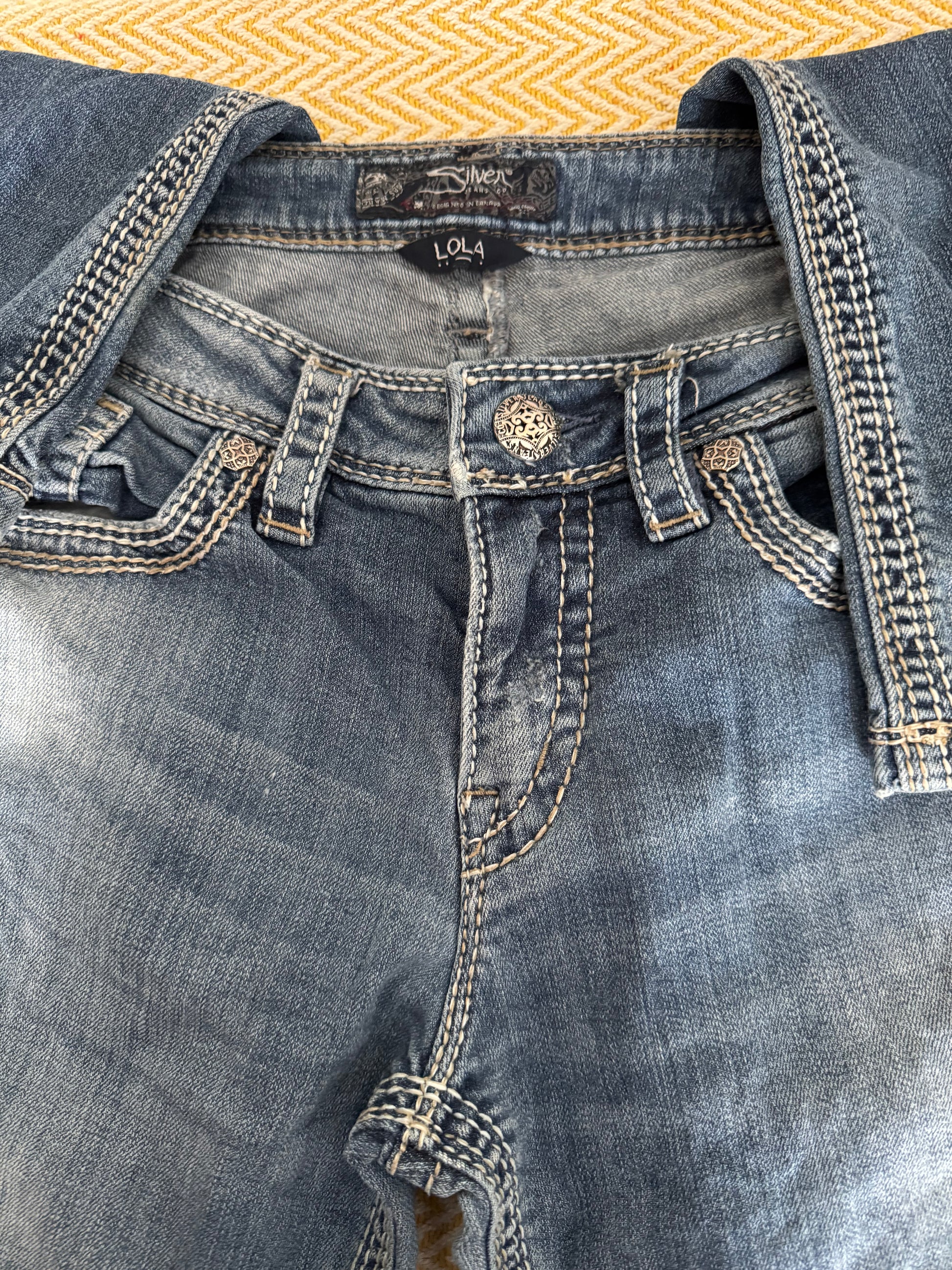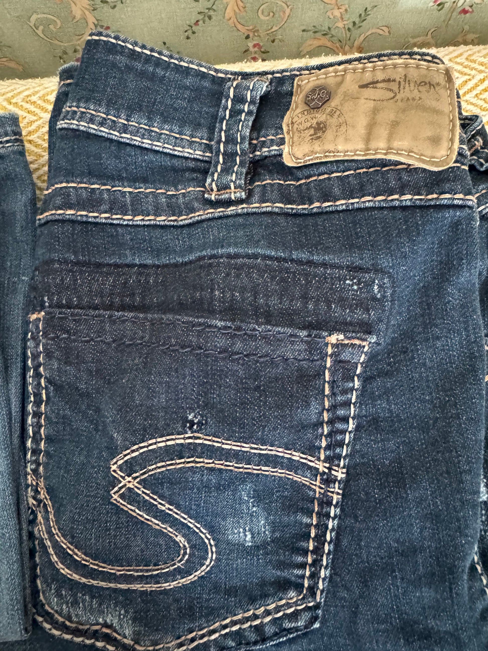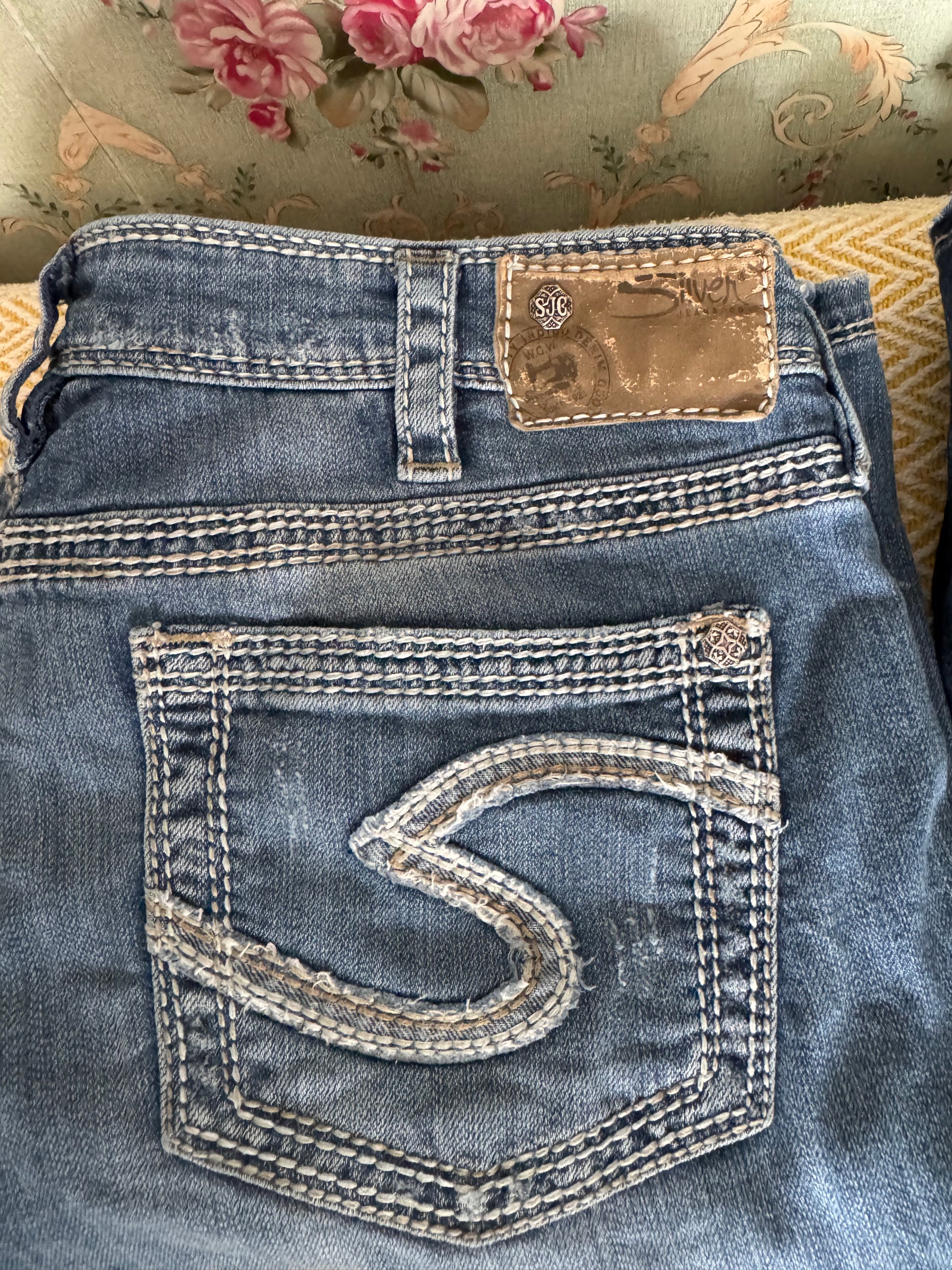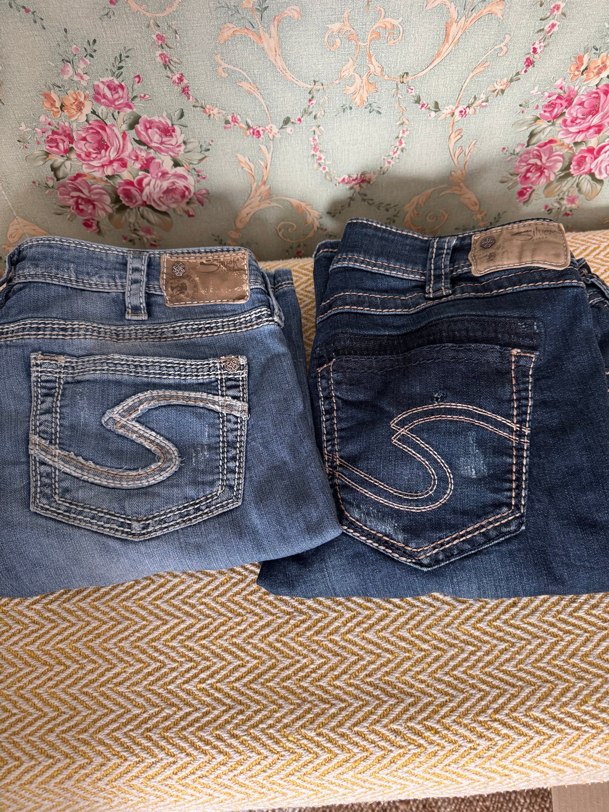 Lot includes two pairs of Silver Jeans Co. denim in classic dark and light washes. Both are comfortable, quality jeans with flattering fits, perfect for everyday wear.
