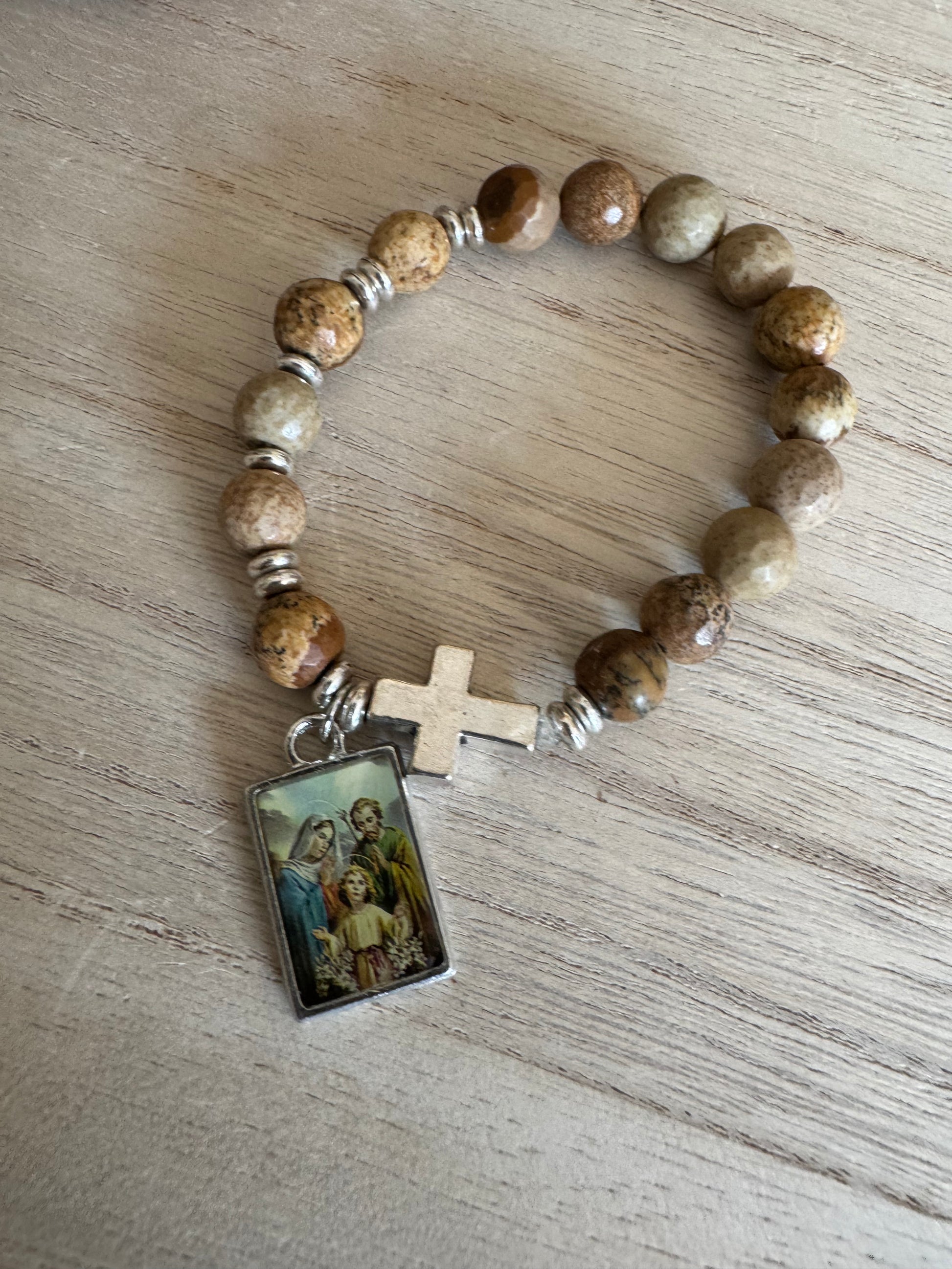 Natural Stone-Look Bead Bracelet with Holy Family Charm