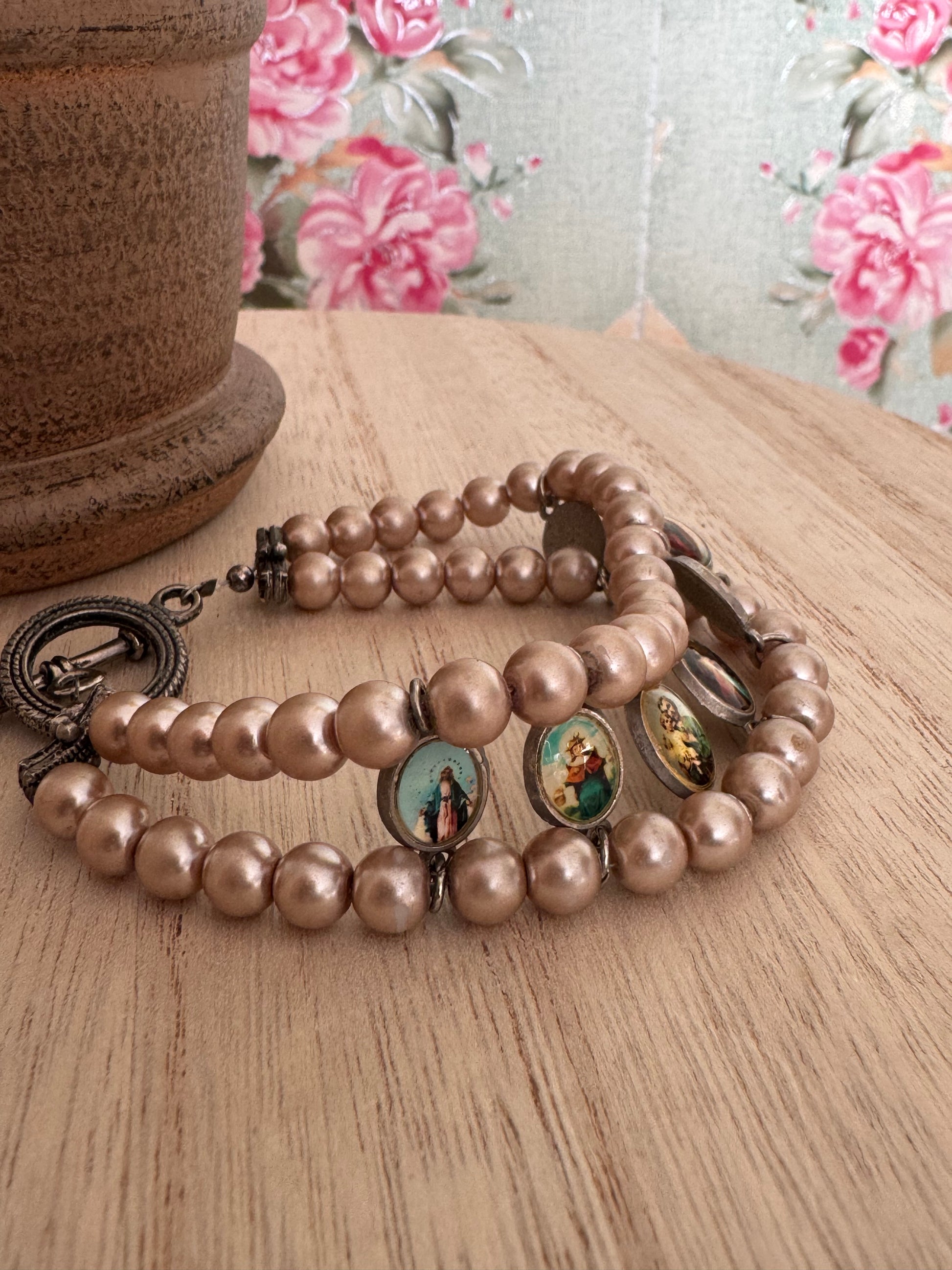 This beautiful handmade charm bracelet features faux pink pearl beads arranged in a unique ladder-style design. Adorned with meaningful Catholic charms, each bracelet showcases a devotional selection that may include Immaculate Mary, St. Joseph, Divine Mercy, Holy Family, Our Lady of Guadalupe, St. Martin, and the Holy Infant of Atocha.